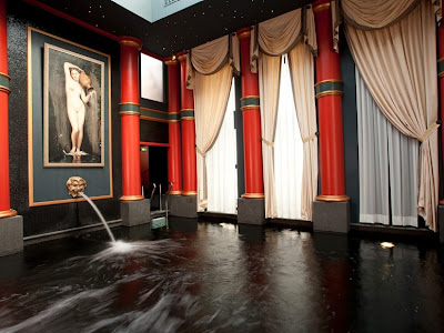 - The look: Fiery Pompeian red and black evoke the decadence of ancient Rome. Decorator Jacques Garcia had a field day with tented nooks, candlelit stairways, black mosaics, and Roman chaise longues, but the centerpiece is the pool: In a dramatic double-height space, water falls from an antique mask beneath a reproduction of Ingres’s La Source.